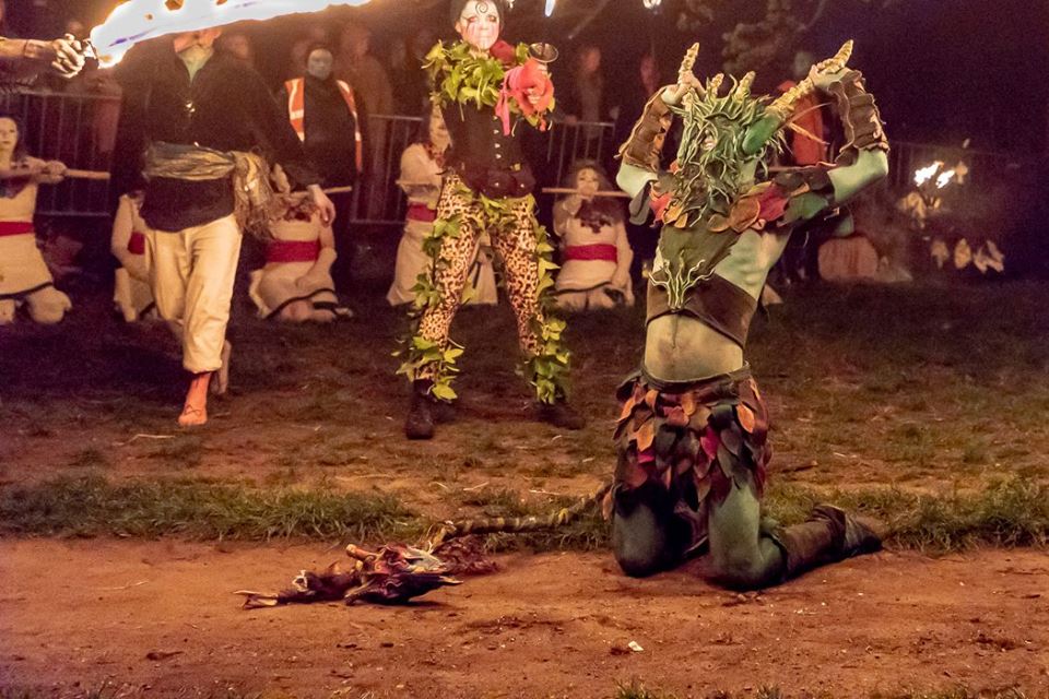 In short, the festival is a procession driven by drums and led by the May Queen, the goddess of summer, and the Green Man. The procession meets various groups along its way, those either help or hinder its progress. During the festivities, the Green Man has to die as the god of winter and be reborn as spring in order to consort with the May Queen. When they are united, they light the bonfire as a symbol of summer's beginning.